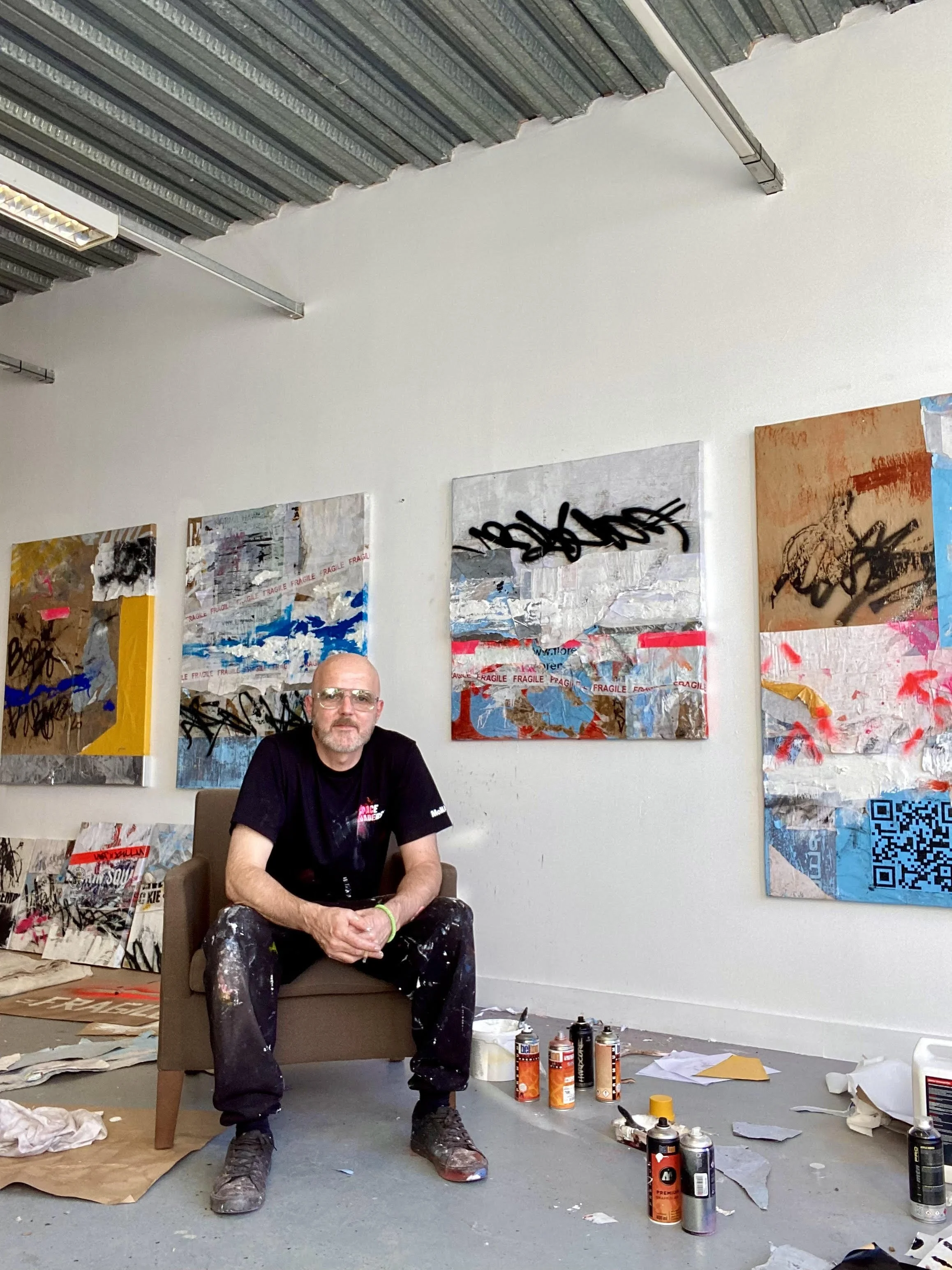 His practice is all intuitive, it’s all about a feeling and it will usually begin by getting inspired by listening to music in his studio and then he will begin the process of starting a painting. This will involve building layers of colour washes, graffiti, collage of posters and plaster and concrete to create a surface language.